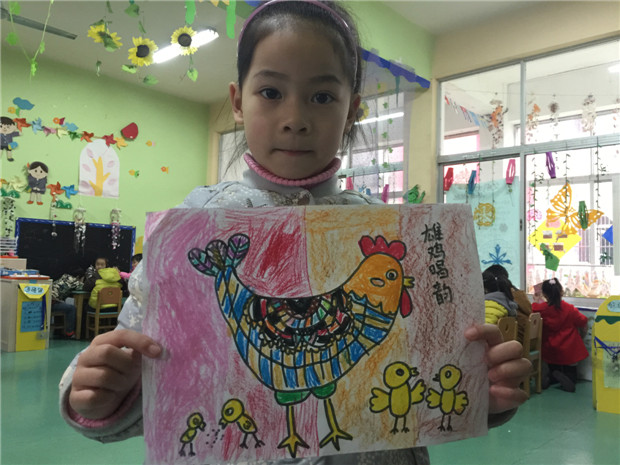 在老师的帮助下,金鸡报晓,彩凤朝阳;雄鸡唱韵,大地回春;闻鸡起舞,大业方兴……等等众多包含美好乃至励志意象的祝福语,被题在了画侧,字画相称,相得益彰。孩子们用稚嫩的笔触、大胆的用色和构图同样创作了一张张充满意趣的作品。
