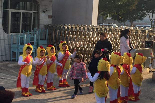 幼儿园门口,在龙城百姓春晚舞台活泼亮相的小金鸡化身“公德小卫士”,随着动感愉悦的《小鸡小鸡》旋律,为全体小伙伴、家长、老师送上“新年快乐!鸡年大吉!”的温馨祝福。