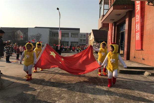 升旗仪式上,“金鸡旗手”托举红旗,昂首阔步,进行升旗仪式,激扬的国歌旋律在幼儿园上空回荡。