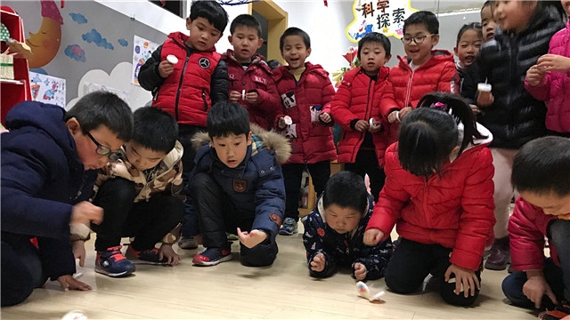 “加油!加油” 一阵阵助威声从新城逸境幼儿园大班教室中传出,原来孩子们在教室里举办陀螺大赛呢。