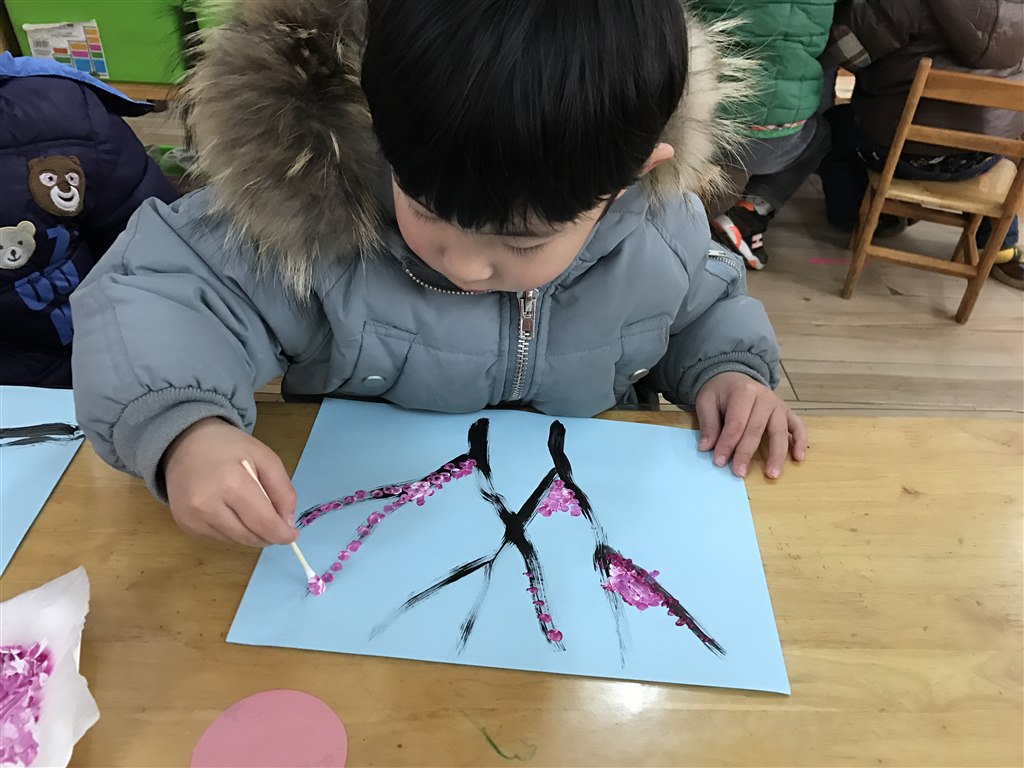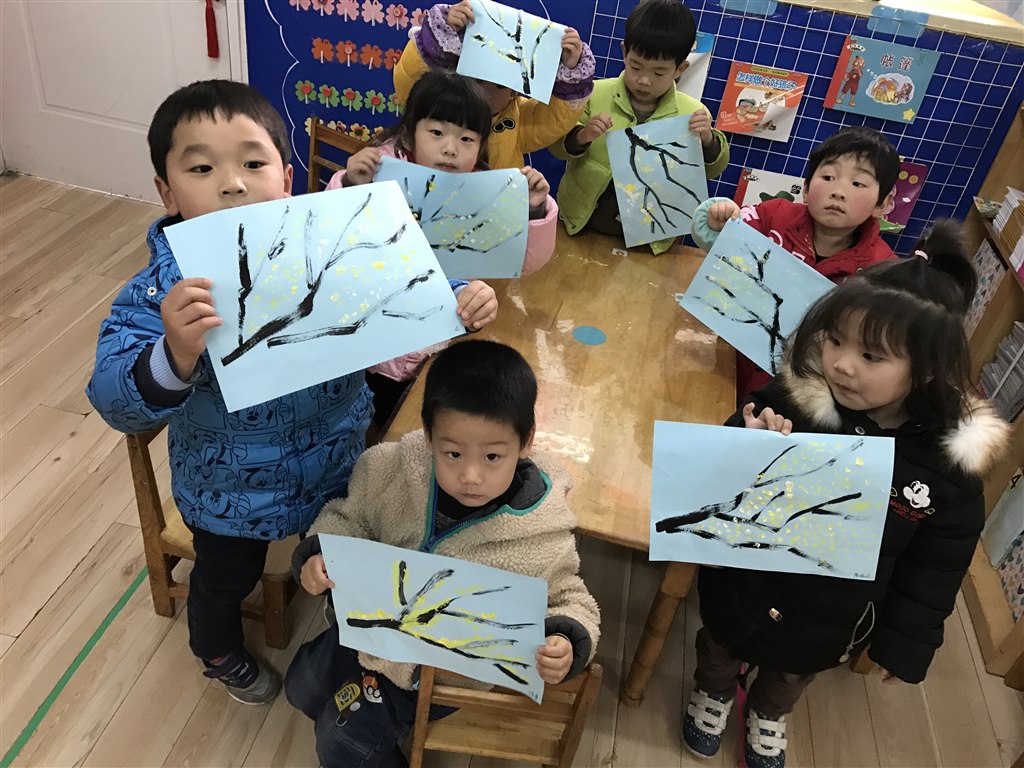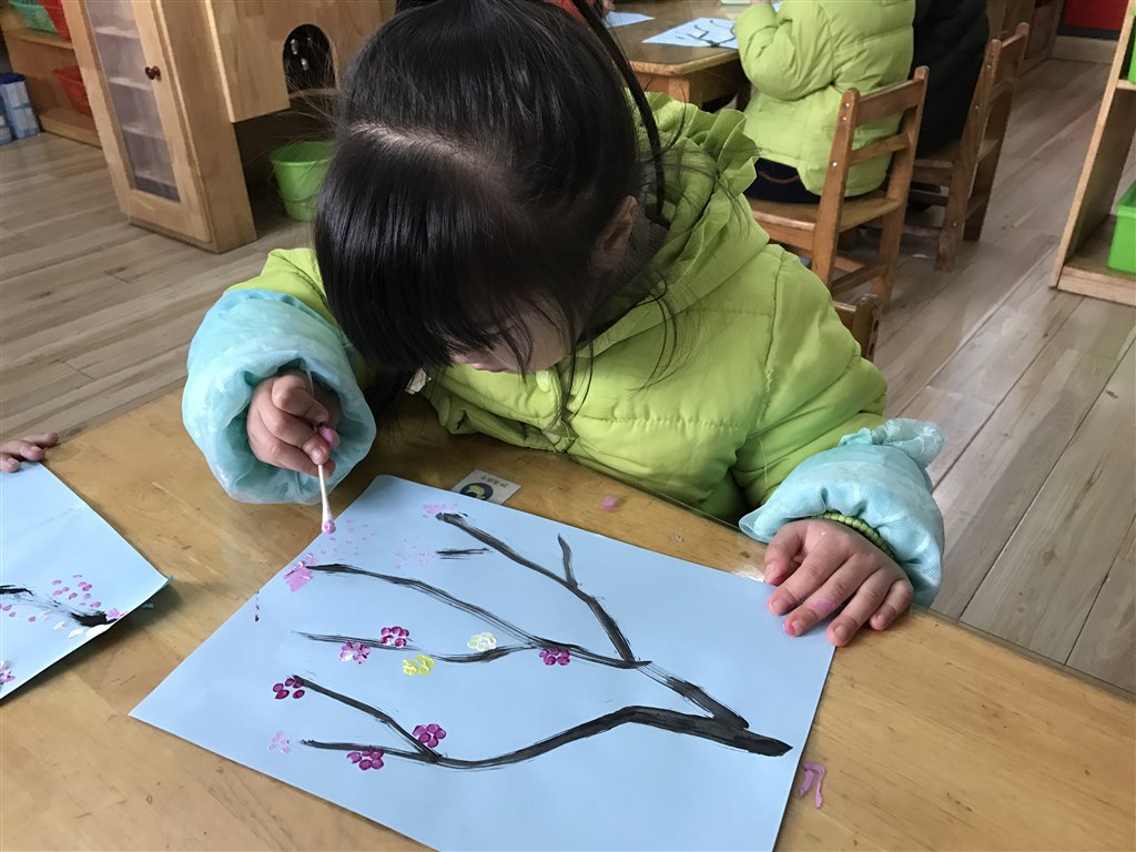 教师为孩子们准备了梅花图和画好的梅花枝干、颜料。通过视频、图片认识了梅花的样子、颜色、花的形状,了解梅花不畏严寒,傲然挺立,其顽强不屈的精神值得我们学习。老师把作画要领以儿歌“小小棉签来喝水,喝饱边上停一停”的形式告诉孩子们棉签要再颜料中蘸一蘸,并在颜料盒边上停一停的形式引导孩子作画。