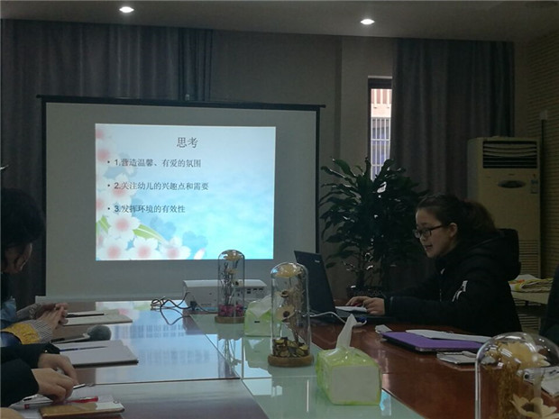 为了让本次活动能生动有效,每个班的老师都针对各自的环境创设精心准备了PPT,各班老师从阅读《0-8岁儿童学习环境创设》后给班级环境创设带来的思考、本班环境创设的整体情况、7个基本区域的呈现、本班环境创设中最大的1个亮点、重点区域逐月开展的具体设想安排等方面进行了详细的解说;最后所有老师聚集一堂共同讨论环境布置的心得。最后夏园长和高园长更是将各班环创的精华提炼出来,提出了以班级环创到论文撰写以及后续班本化主题活动的推进新思路等宝贵建议。