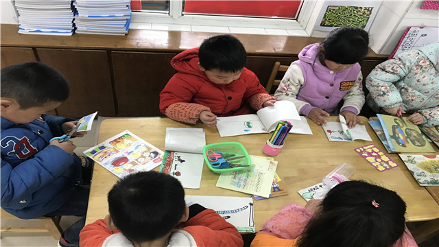 图书内容可以是家庭生活中的小故事,孩子们之间发生的有趣事,也可以将平时听过的故事进行改编或创编,用简单的图画表示出来。孩子们可以通过绘画、剪纸粘贴(收集的废旧图书)、照片剪贴等多种形式表现,使用材料不限,鼓励孩子们创新。活动过程中,每个孩子都非常地投入,他们画着、剪着、贴着,一本本小图书上画满了他们美好的童年回忆,画满了他们遇到的一件件有趣的事。才一节课的时间,大部分孩子完成了图书的制作。看着孩子们在一起相互介绍着自己亲手制作的图书,我们也为他们感到高兴。