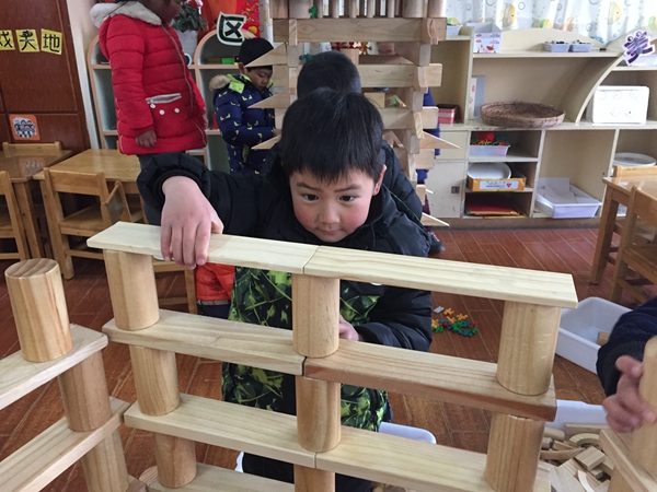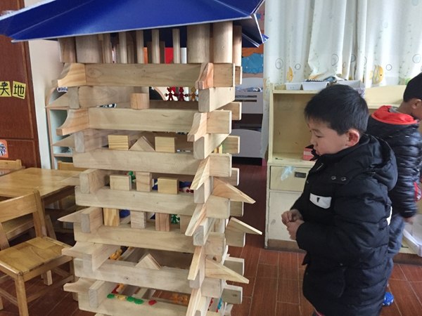 漂亮的花园、路边的一幢幢建筑、红梅公园、天宁宝塔等都从孩子们灵巧的手中变出来。一个小男孩高声喊道:“你们要造房子要带好安全帽,当心砖块砸到头!”“我们的宝塔建成了,上去看看塔顶的风景吧!”说着,就把一个个小人都放到了塔上……游戏中他们能自由、大胆地发挥自己的想象力和创造力,去搭建他们心目中的作品。建构过程中,孩子们通过语言的交流进行合作,运用了平铺、延长、接插、垒高、对称、围合盖顶等方法,不断丰富着主题内容,体现出了较高的建构水平和丰富的想象力。