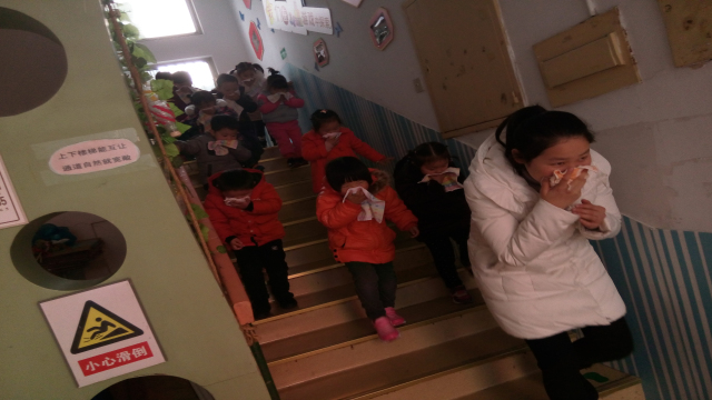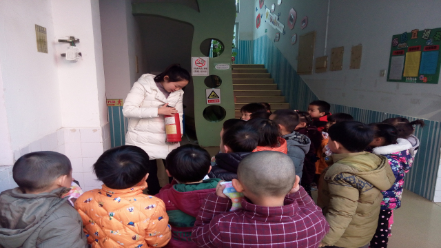 同时,为普及消防知识,我园老师除了教唱“消防儿歌”,还开设“消防知识”讲座、“消防演习”等,教师在消防知识讲座中通过讲解图片、如何使用灭火器等引导幼儿从小树立“消防”观念。在消防演习中老师交给幼儿正确的逃生方法,手捂住口鼻,弯腰低头姿势进行,迅速向教室外撤离,到达安全地点。