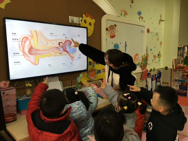 在全国爱耳日来临之际,为了让我们小五班的小朋友更好地了解爱耳、护耳的方法,我们开展了“保护小耳朵”的主题活动。我们两位老师分别从耳朵的构造讲起,让小朋友们了解了耳朵由外耳、中耳、内耳组成。重点讲解了如何保护耳朵,防止听力受损。同时通过观看“保护耳朵”的动画视频,告诉小朋友们耳朵和与眼睛一样,需要细心呵护,要保持良好的视听环境,培养聆听习惯,正确保持耳部卫生。