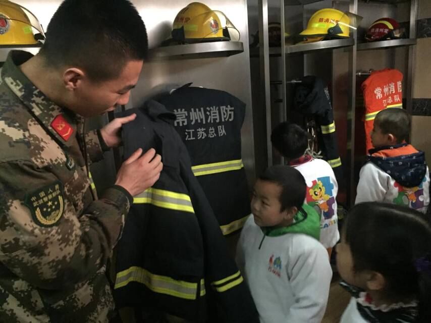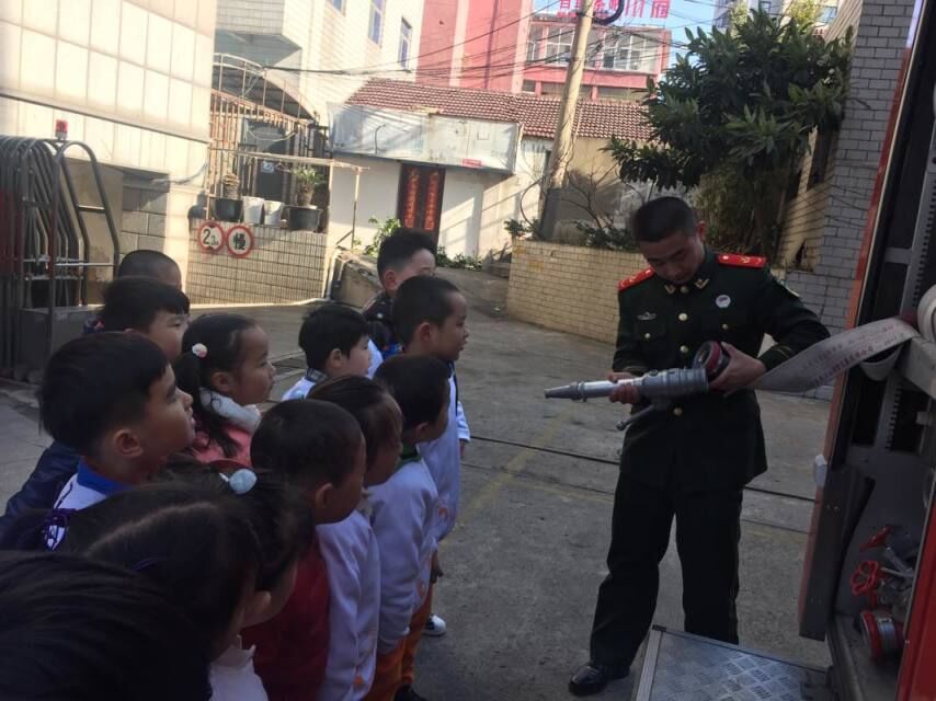 一到目的地,师生们就受到了消防官兵们热情地接待,介绍了消防车辆和一些随车器材装备并打开车上的一扇扇小门,用简单易懂的语言给大家介绍了许多消防车上的小秘密:消防器械、高压水枪、防毒面罩、氧气瓶、急救箱等消防装备。接着,孩子们在消防员叔叔的带领下,有序地参观了消防队的环境设施。他们介绍了衣服的用途,从而使孩子了解消防员们在执行不同的任务时,需选择合适的服装的用途,孩子们还尝试穿消防服,每个孩子的脸上都洋溢着自豪和满足的笑容。最后,孩子们参观了消防叔叔的休息室和学习室,看到那些有棱有角的被褥和摆放整齐的各类生活物品,孩子们都忍不住惊叹起来“哇,好整齐哦!”消防员叔叔还介绍了平时除训练外还通过阅读、组织乐队丰富自己的生活,我们从心底佩服消防员叔叔。