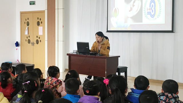 此次活动,专门邀请常州第三人民医院的潘护士为教师和孩子上了一堂生动的爱耳知识讲座,护士阿姨先用谜语引导幼儿认识耳朵,专门为孩子组织了一次图文并茂的爱耳知识活动,以观赏图片、听故事、现场与小朋友答疑互动,讲解耳朵的结构、功能,怎样预防耳病的发生等爱耳知识,比如:不要经常掏耳朵;水流入耳朵内,拍拍另一只耳朵;不能往耳朵里塞东西,耳朵受伤时一定要去看医生;听到很响的声音要张大嘴巴;要定期检测听力等等。最后通过游戏“猜猜我是谁”、“好听的声音”来感知听觉的重要性和趣味性。