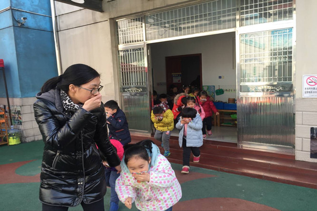 3点,演练正式开始。警报声响起,老师、孩子立即停止游戏,迅速拿毛巾或用袖管捂住口鼻,有序从指定路线撤退;警报声响起,阿姨、保安立即停下手中的活儿,迅速跑到自己指定看护地点,维护秩序,查看班级里是否有遗漏的孩子;警报声响起,园长、分管园长立即跑到各个集合点,查看孩子撤退情况、教职工执行状态等。