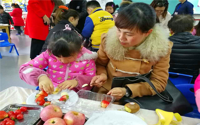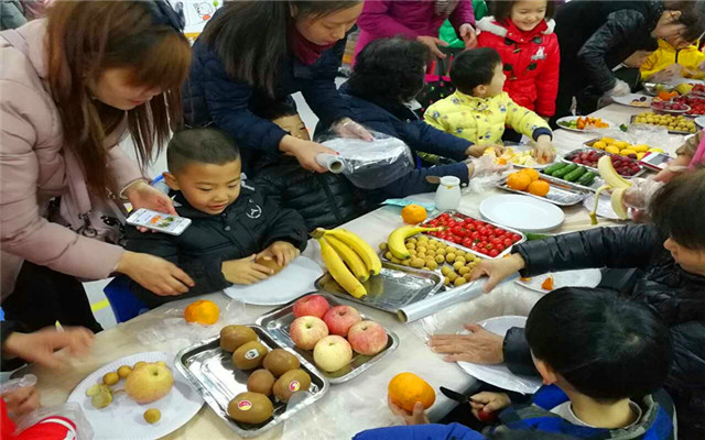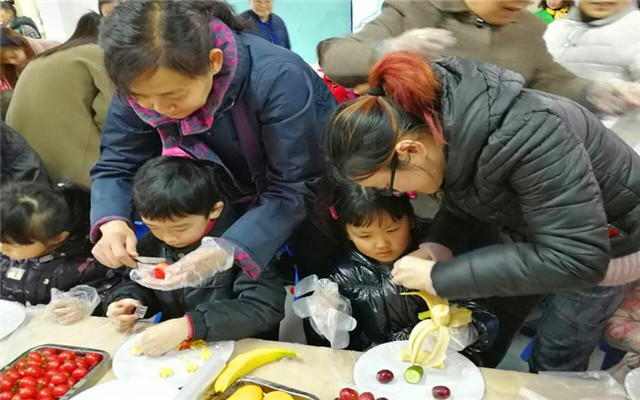 活动现场热情洋溢,家长和孩子们尽情发挥自己的创意,运用自己灵巧的双手,分工合作,非常投入。你看,他们或切或拼,或挖或雕,忙得不亦乐乎。那一幅幅亲子同乐、智慧共享的美好场景足以令你感动。经过半个小时的亲子合作,一盘盘形态各异的水果拼盘展示大家面前。看着这么精美的果盘,个个心里充满了成功的喜悦。