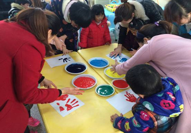 活动一:“爱的痕迹”,孩子们与妈妈一起“印手印”,共筑爱的痕迹,这是妈妈与孩子们一同创造的第一个“爱心”,第一份“祝福”。