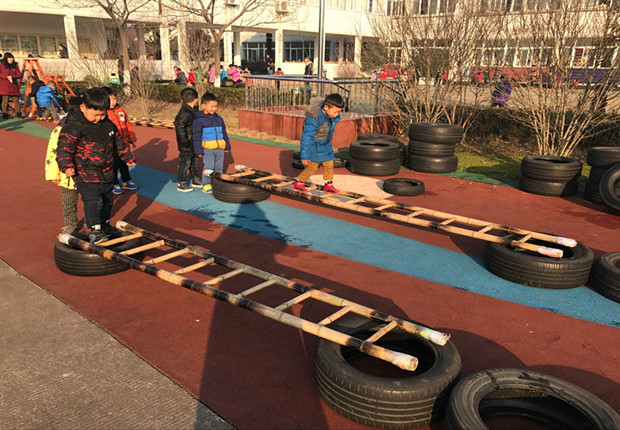 户外活动时间到了,孩子们纷纷跑向了轮胎区域。“我要大的。”“我喜欢小轮胎。”孩子们选择好自己喜欢的轮胎,有的滚,有的钻,有的跳,有的当成蹦蹦床,一蹦一跳真好玩。有的把轮胎当成了小摇篮,摇摇摇,宝宝睡着了;还有的小朋友合作抬来了梯子,将两头架在轮胎上,孩子们一个接一个,张开胳膊保持平衡,小心翼翼地走到终点。敢于挑战的孩子们,加高到2个轮胎,架上梯子,依然走的很平稳。小小的轮胎带给了孩子们无穷的快乐,操场上到处洋溢着孩子的欢笑声。