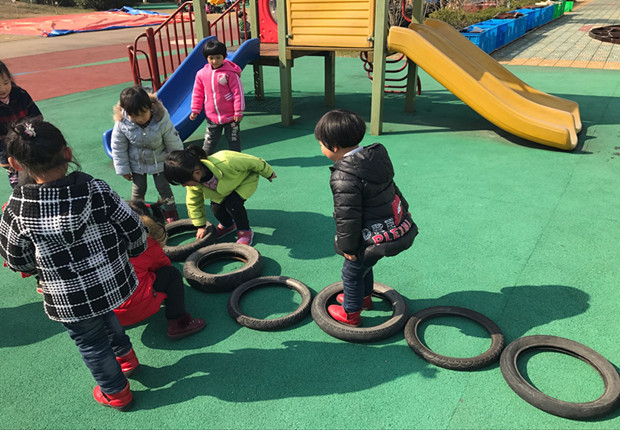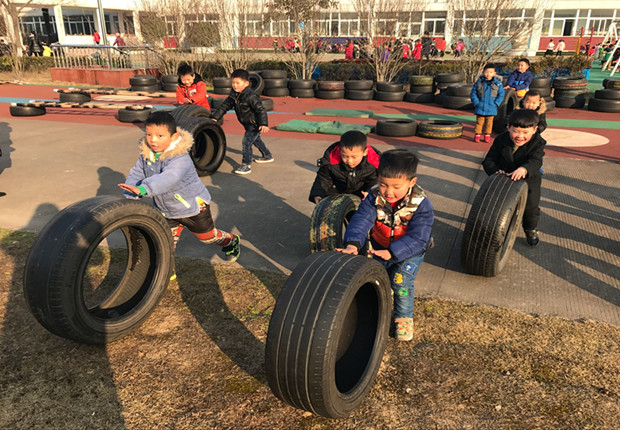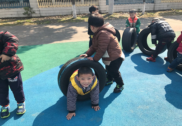 为全面促进幼儿身体发展,三河口幼儿园本着发展与游戏并重的原则,着手打造兴趣运动,利用废旧轮胎做文章,形成了本园独有的轮胎趣味运动。幼儿园的香樟树下有许多的轮胎秋千,塑胶跑道上,摆满了大小不一的轮胎。为了挖掘轮胎的更多奇特玩法,近日中班开展了“玩转轮胎秀”活动。