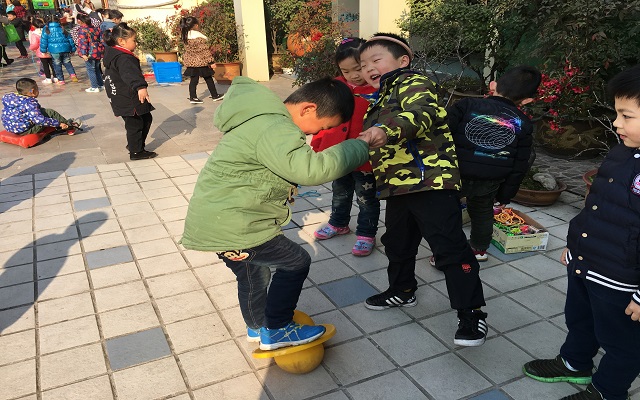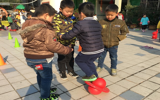 你瞧,跳板球作为一种适合于大班年龄特点,锻炼平衡、促进大腿肌肉发展和弹跳能力的运动器械,在孩子们互相学习的过程中深深地进入了他们的心里。由于踩踏不稳的原因,孩子们自己动脑选择可扶持的石柱,尝试稳稳的踩踏,教师提供支架,拉住一个幼儿的双手分配一部分力量,让幼儿双脚加紧往上跳跃,这一支架让其他幼儿学习在心,纷纷选择自己的好朋友两两合作尝试学习,一次次摔倒不气馁,紧握的双手、明确的要点、鼓励的话语诠释着幼儿之间的友谊力量。由于幼儿具有个体差异,有的孩子已然可以自己上板、跳跃、下板,教师鼓励他们当小小平衡跳板球教练,瞧他们教的多认真,受到了小伙伴的一致热捧和依赖,收获到了一脸的满足和幸福感。