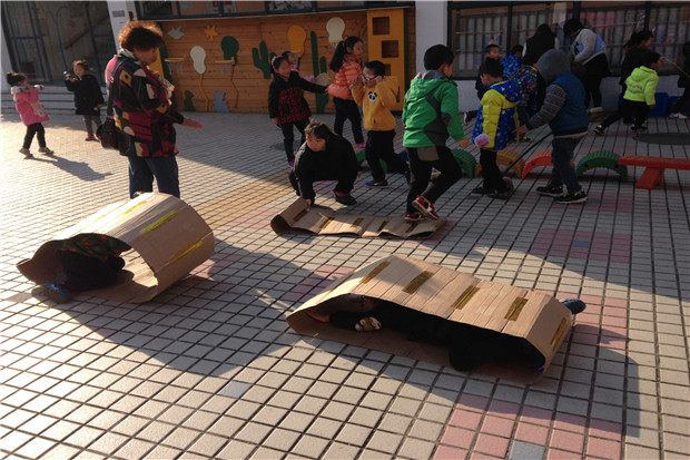 户外游戏是孩子们独特的学习方式,游戏中的孩子们是快乐的、自由的。 近日我园教师给孩子们提供了更开阔的场地,更自由的空间,使每个幼儿能够自主、自愿的参加户外游戏,同时增添了各种废旧材料和游戏设施:废旧纸箱、锅、铲、小喷壶、塑料瓶、积木块……这些废旧物品在孩子们的眼里就是宝贝,就连后操场上的大树都可以是孩子们每天拥抱的“好朋友”。孩子们在游戏中相互交往,学会分享、合作,动作发展的灵敏度、勇气、毅力得到了充分的锻炼。