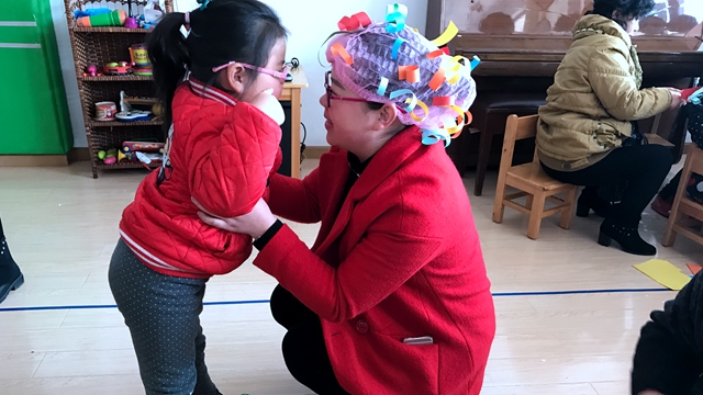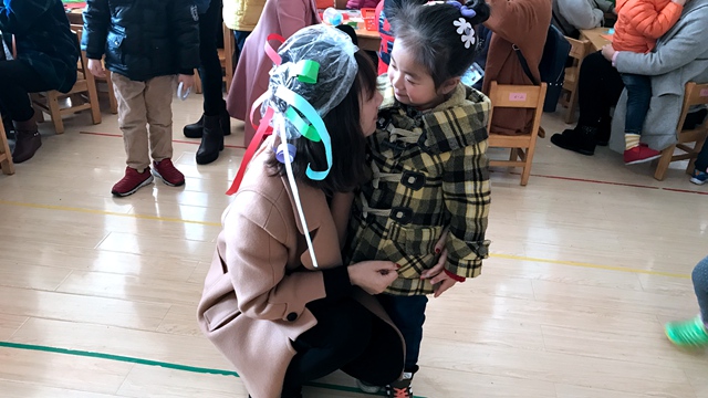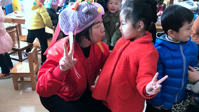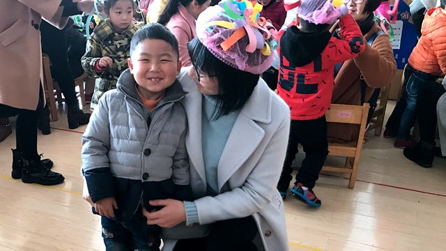 小朋友用自己稚嫩的双手,捧着手中这顶浓密的五彩假发,戴到妈妈的头上,在场的妈妈们都感受到了孩子们的浓浓的亲情,享受着孩子们带来的阵阵欢乐!