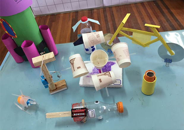废纸盒、泡沫、塑料管、塑料杯、饮料瓶等这些不起眼的废弃物在孩子和家长们的奇思妙想和巧手里变成了一件件高科技的小发明。如,有的家庭利用废旧饮料瓶和彩纸制作了神舟九号;有的家庭利用小木块制作了木筏;还有的家庭卸下了玩具上的零件创意制作了音乐盒等等。每件作品不但有创意、新颖、美观、有操作性,更主要的是件件作品凝聚了家庭智慧,表达了一个家庭、一个家长对幼儿科技能力的引导和培养。