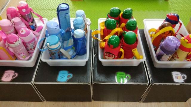 班级内的生活区放着孩子们每天出去户外游戏要带的水壶,水壶统一放在一起。开始的时候,老师们都觉得没有问题,但是过了一段时间,发现孩子们经常会拿错别人的水壶,于是我们利用晨间谈话“水壶怎么放”展开讨论,孩子们有的说要把水壶放在矮一点的框子里,有的说粉色和蓝色不能放在一起……听了孩子们的话,我们找来了四个矮的筐子,并让孩子们尝试着把水壶按颜色进行分类。果然,比之前更加清晰了。水壶按照颜色分类以后,为了孩子遵循“看得见、拿得到、放得回”的原则,老师又给筐子和柜子做了一一对应的标记。