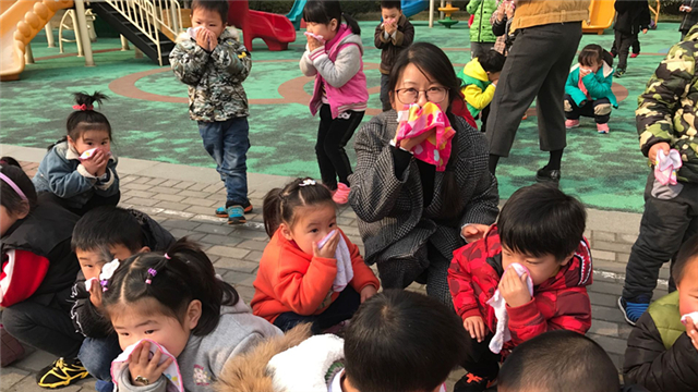 演练开始时,随着急促的消防警钟敲响,各班教师立刻打开活动室前后门,引导幼儿按预定的撤离线路快速有序地进行撤离。在幼儿园走廊和楼道口,都有教职员工指挥,一边喊话让幼儿切勿拥挤和慌张,一边提醒幼儿捂住嘴鼻,躬身前行撤离到操场。