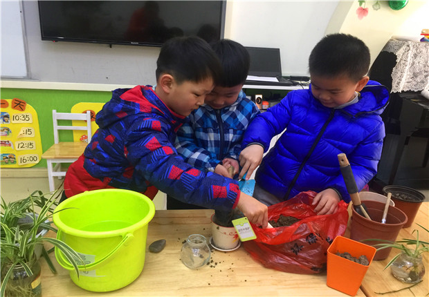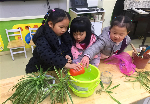 老师准备好了水、泥土和容器,为了更好地观察吊兰的生长情况,水培选择了透明的玻璃容器,还有鹅卵石装饰呢,材料准备齐全,下面轮到小朋友们自己动手啦,倒水、放鹅卵石、挖土、种植,大家明确分工,忙得不亦乐乎,不一会儿水培的、土培的吊兰就都完成啦。小朋友们小心翼翼地把它们放在置物架上,有小朋友还对着自己种植的吊兰说起了悄悄话:“吊兰,你快快长大哦!”。
