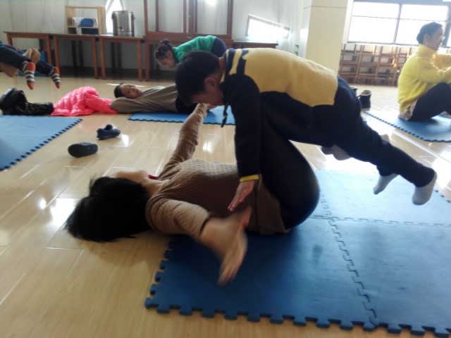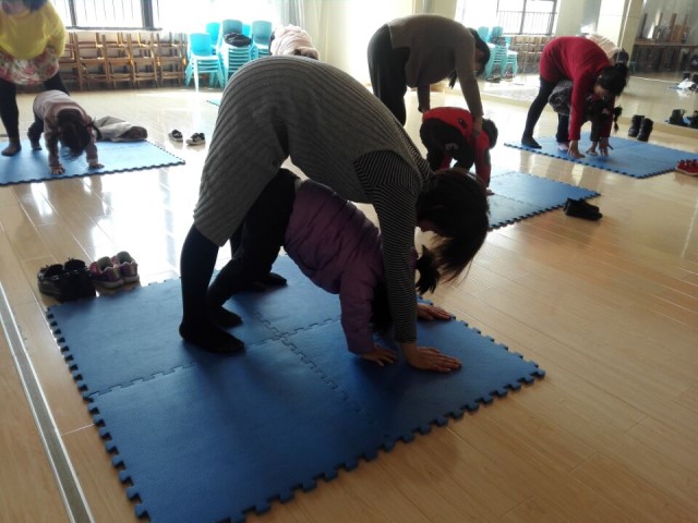 瑜伽通过推、拉、扭、挤、伸等各种姿势来舒展身体,释放心灵,享受着瑜伽练习带来的宁静和放松。教师们还从未接触过瑜伽,赵老师就从瑜伽坐姿开始,指导她们先学习闭目养神和正确的呼吸气方法。然后通过提示语,带教师们开始了入门训练。活动在轻柔的音乐声中开始,老师们和孩子调整气息、舒缓情绪,在赵老师的指导下开始练习各种瑜伽动作:“婴儿式”、“亲驼式”、“背驼式”、“跨坐式”,看似简单的几个动作要做到位却没那么容易。