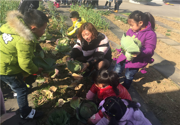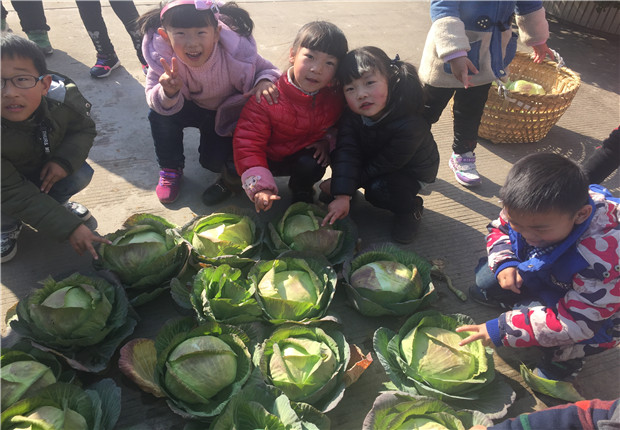 去年播种的包菜如今终于长大了。一早,中六班的孩子们随老师来到小菜园,欢天喜地地采摘起了包菜,“我拔出来一颗了。”“我的这颗比你的大呢!”“我的这颗包菜包得好结实呀。”孩子们你一言我一语,心情无比的快乐,陶醉在收获的喜悦中,久久不能平静。他们期待着让厨房里的阿姨把包菜做给全园的小朋友分享,和全园的孩子一起品尝,孩子们在品尝的过程中再一次地感受丰收的喜悦,同时也学会了分享。