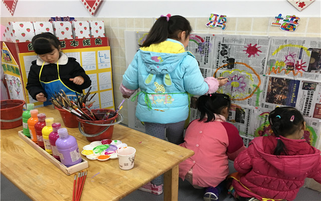 小班、中班组搓柳条、插花,将春天元素带进班级,大班组结合我园乐创美术课程,用绚丽的色彩在涂鸦墙上大胆挥毫,勾画眼中春天的美好世界,传递着春天美妙气息。