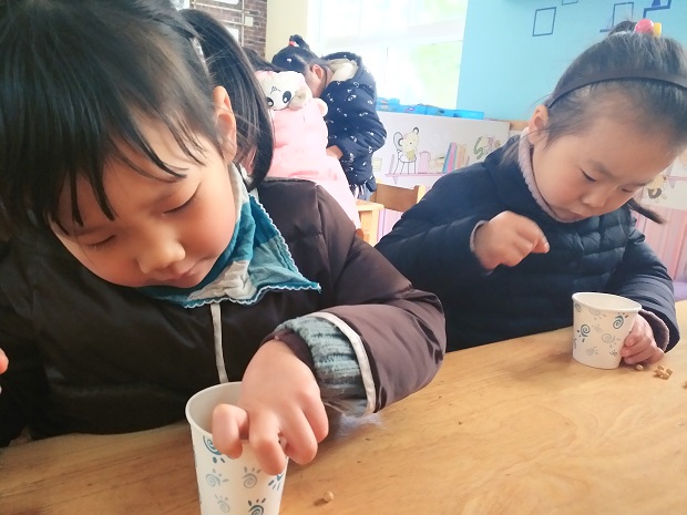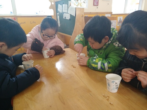 天气晴朗,艺术幼的老师带着孩子们在户外感受春天,沐浴温暖的太阳,春风的抚慰,雨露的滋润,孩子们知道春天已经到来,植物在阳光,春风,雨露的帮助下,也会长的又快又好。老师们还开展了识豆豆,种豆豆活动,孩子们兴致都非常的高,小心翼翼的培植自己的黄豆宝宝,悉心照料,下课就跑到窗台边上看发芽了没有,水培法,土培法,棉花培植法,放阳台上,或阴暗处,让孩子们观察比较,哪一种方法培植的豆子长的最快,让孩子自己去发现阳光,水分,等对植物的作用。