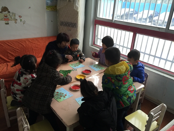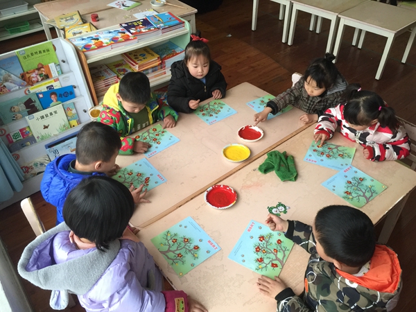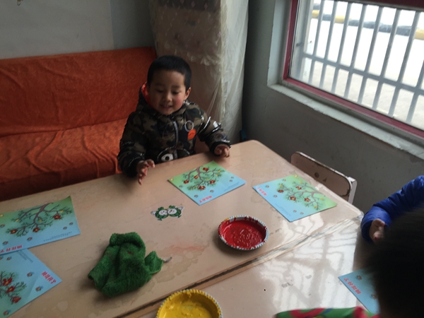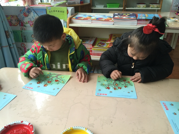 看着孩子们用他们的小手指在颜料盘里蘸一蘸,慢慢拿起按下去,在纸上点画着桃花有大的,有小的,有的多有的少,不一会儿纸上就开满了美丽的桃花,体验到自己的成就感。