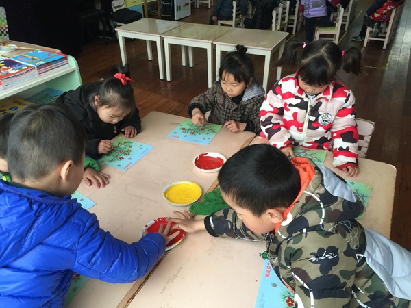春天是一个五彩斑斓的世界,大地焕然一新……随着季节、气候的转变,孩子们都发现了春天的到来。当孩子们在散步的时候,他们发现柳条绿了、桃花开了、迎春花吹着喇叭在高歌、蝴蝶更是忙着在花园里面采蜜、太阳晒在身上暖洋洋的……孩子们用他们的感官发现了大自然的变化,感受到了春天的美丽,孩子们对于春天里的事物更是津津乐道起来。我班结合主题计划和季节特征,开展了手指点画《桃花开了》的美术活动,本次活动主要是让孩子们在感受浓烈的美丽的春天气息中,让孩子尝试用点画这一表现形式来感觉艺术的多样性。“手指点画”活动就是用手指蘸点颜料后在画纸上点画成形状和物,从而显现出千姿百态而组成一幅画的一种美术形式。“手指点画”活动,工具独特,操作方便,气氛轻松,而画面却变化无穷。而且从作画的过程来看,具有挑战性,也是让幼儿不断想象、创作的过程。从而激发幼儿能够积极参与美术活动的兴趣,让幼儿初步感受用手指点画的乐趣,促使幼儿对美工活动能够产生更浓厚的兴趣。同时在不断联想构思的过程中,思维的发散越来越流畅,想象越来越丰富,使手、眼、脑得到了协调的发展。