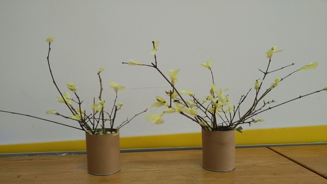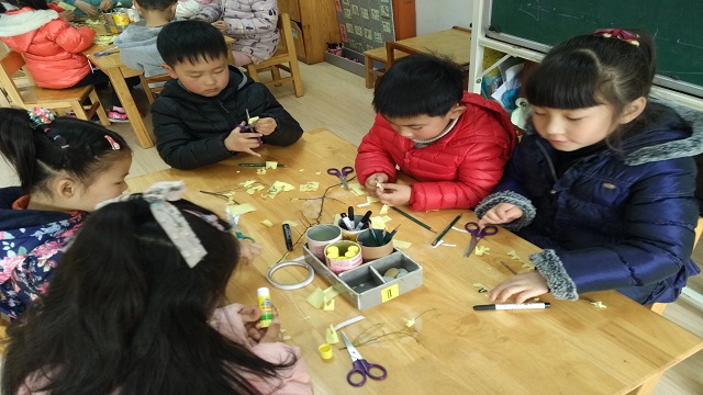 孩子们用捡来干枯枝条当做迎春花的花枝,用皱纹纸来剪出迎春花的形状,把剪出来的花瓣用胶水粘贴在干枯的枝条上。一朵,一朵,又一朵……慢慢的原先还干枯毫无生命力的枝条变得生动起来,孩子们给花树枝注入了新鲜的活力!看着通过自己动手制作出的迎春花,孩子们美在其中。