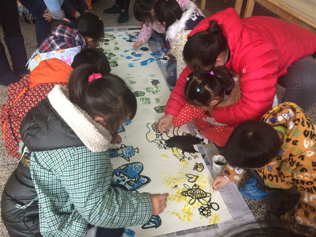 首先,跟着我们大班的哥哥姐姐去踏青吧!脚跟踩一踩、脚尖点一点、脚掌踏一踏,孩子们在春天的大地上留下了一个个美丽的脚印,蓝色的、黄色的、紫色的、、、、、、在老师的帮助下,孩子们用棉签棒蘸着墨汁把脚印变成了一个个刚刚从池塘里苏醒的大龙虾、一个个高耸入云的城堡、一只只小白兔、一朵朵鲜花等,孩子们的想象力真的是太丰富了。