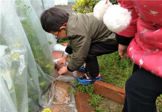 瞧!他们有的搬砖,有的剪开固定的扎带,然后三五个人一起将暖棚的薄膜大衣掀起,嘴里还喊着口令“一、二、三,开始!”生怕一个不小心碰到了暖棚里长势喜人的蔬菜。温暖的大棚不仅让植物在冬天生长良好,也让杂草有机可乘,暖棚掀开后,大家又一起动手将杂草拔除干净。虽然整个过程有苦有累还有泥,但孩子们热情高涨,也懂得了蔬菜粮食来之不易的道理。