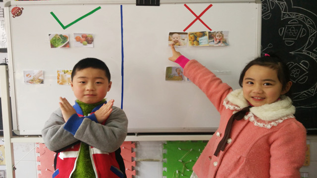活动的开始,老师通过给孩子们讲述一个个真实的小故事如《为什么肚子疼》、《乱吃药的明明》等,激发孩子们对食品安全的关注度,从而使孩子们知道了不能乱吃东西。接着,幼儿在“判断对错”的操作活动中对各种食物和事件进行判断并说一说理由。孩子们你一言我一语,讨论得热火朝天,在和同伴相互讨论、合作的过程中他们知道了:水果要洗干净了再吃;买食物的时候要看好生产日期和保质期;被苍蝇叮咬过的食物不能吃;不能随便把细小危险的东西吃到嘴巴里……最后,抢答游戏“谁最厉害”将活动推入了高潮,幼儿根据老师描述的事件快速抢答判断对错,进一步巩固对食品安全的认识。