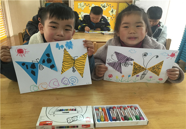 在活动中,孩子们首先通过欣赏体验,结合事先在公园观察到的蝴蝶形态,想想说说自己想给蝴蝶画怎样的花纹,接着老师提供彩色卡纸,让孩子感受剪纸、撕纸艺术作品的美,从中提高了孩子观察感知、审美的能力;最后孩子们在做做玩玩、动动小手的活动中激发对美术造型表现及欣赏活动的兴趣,同时也形成初步的与小朋友合作的意识。