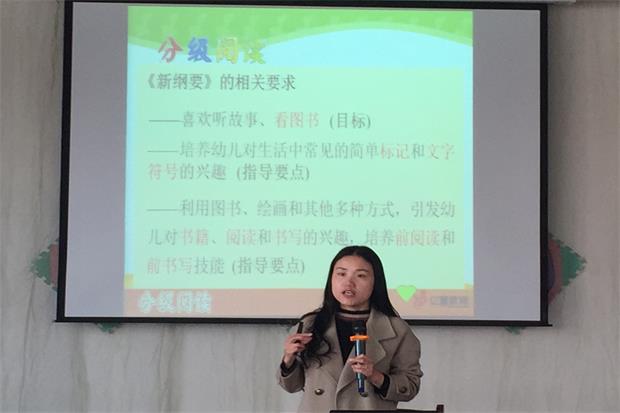 培训中,安老师主要围绕“早期阅读对幼儿的价值”“阅读课程的特色”“怎么选择阅读材料”等内容做精彩讲述。期间,从绘本赏析入手过渡到材料的使用,从材料资源的使用延伸到分级阅读等层面,深入剖析了如何有效使用绘本,充分发掘绘本阅读的价值,在绘本教学中真正找到适合孩子的教学方法。同时,安老师还通过模拟现场教学情境,带领老师走进不一样的阅读世界,老师们纷纷感叹:原来诗歌、儿歌还可以这么玩!