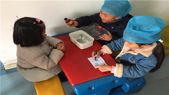 在角色游戏室的一角整齐摆放着大家一起收集来的废旧物品再利用的游戏材料,经过分类,孩子们可以根据自己的角色分配选择相应的游戏材料,自主创设出:医院、超市、美容院和餐厅等游戏环境。在游戏中,孩子们不知疲倦地在游戏室来回走动,去找工作:有的应聘理货员,整理超市货架;有的应聘化妆师、给客人化妆;有的应聘护士,给病人取药等等。他们赚着“钱”,又花着“钱”。体验着工作的责任,憧憬着长大以后的梦想。