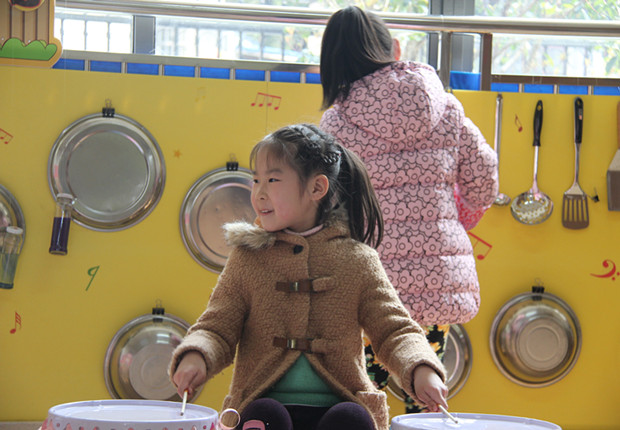 奥尔夫室里他们用蛙鸣筒摩仿秋夜的蛙声,用腕铃描绘春江细雨,用语言与拍打肢体来演绎节奏,通过视、听、触、奏,最大限度地调动和开发各方面潜能,孩子们畅游在美妙的音乐世界中。原生态室充满趣味的空间,生活中常见到的各种瓶瓶罐罐在这里都成了能发出悦耳声响的小乐器,孩子们在敲敲打打中感受着声音的奇妙和多元化。