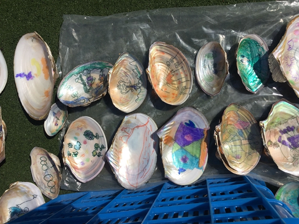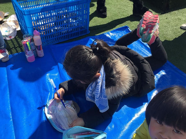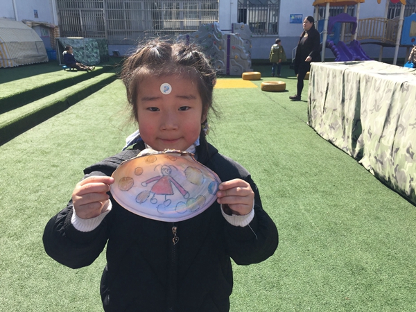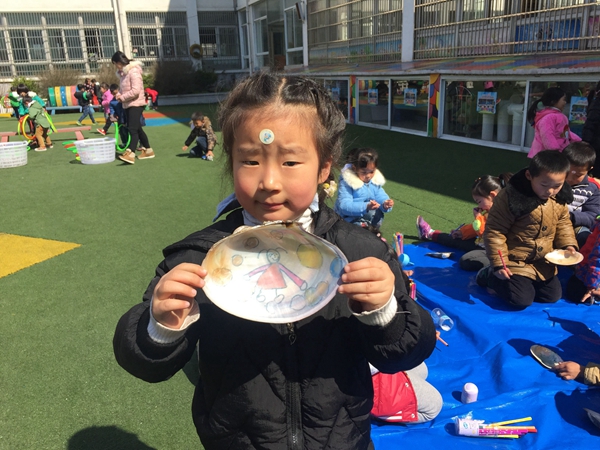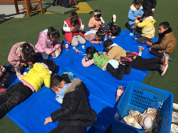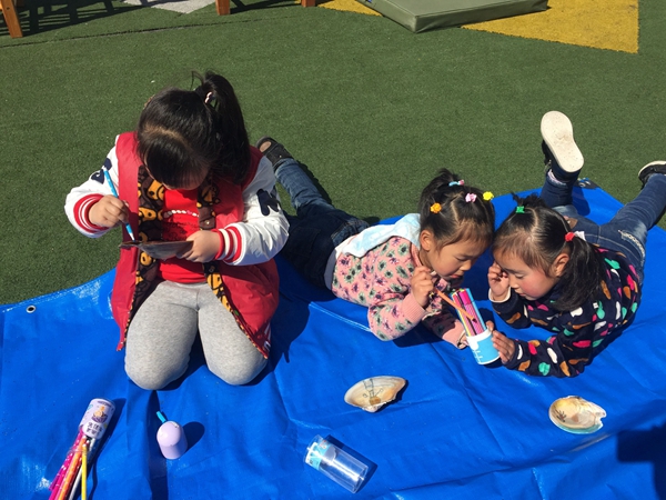 而在我们幼儿园里,更加是注重孩子的自由发挥的个性,在多彩多样的户外游戏里,除了运动类游戏,也增添了静态类游戏,做到动静皆宜,所以我们的绘画就是其中一项。从集体教学到户外活动、从传统的桌面绘画到自由开阔的户外场地,我们都坚持发展孩子的绘画技能,在材料的准备中,我们也大胆想象,增加了许多孩子们熟悉的生活中非绘画材料,例如:各种瓶子、罐子、纸筒、大小不一的鹅卵石、帽子、蚌壳等多样材料。并及时发现孩子的兴趣点,发展他们的想象力,瞧,孩子们在场地上完全是快乐的、自由的、自主的。