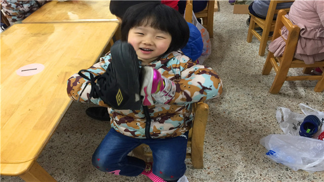 本次活动大部分幼儿都能穿着大鞋子协调地走,锻炼平衡能力,既锻炼了身体又开心的体验了一回做爸爸的乐趣。 潘若鸿