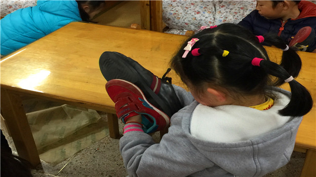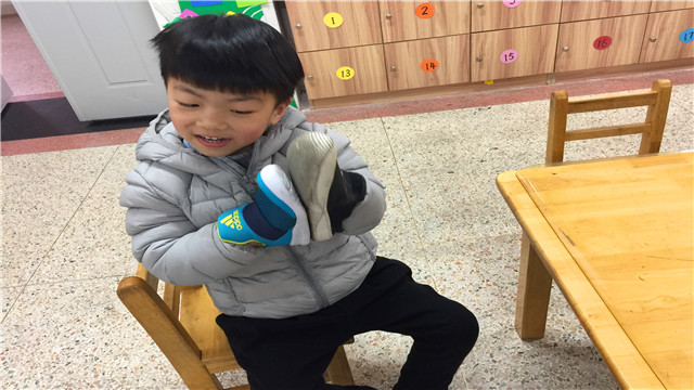 为了满足孩子们想模仿爸爸的欲望,老师请他们穿上大鞋子,自由感受穿着爸爸鞋子的感觉。问:该怎么穿走路时大鞋子才不容易掉。带着问题,孩子们感受变成爸爸的快乐,在自主体验过程中,每个孩子脸上都洋溢着兴奋开心的表情,有的孩子还大声尖叫:哦!我简直就像踏着两只小船,太好玩了。