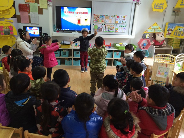课堂上,保健老师先组织老师们做了关于交通安全的答卷,帮助老师准确把握孩子们心理特点,然后结合多媒体给孩子们展示了交通安全宣传教育漫画,通过课件帮助幼儿认识常见交通标志标识,并从如何安全走路、安全乘车给孩子们作了讲解,介绍了“遵守交通信号”、“行走斑线”、“安全乘坐车辆”等基本出行常识。最后,组织孩子们进行交通安全小游戏活动,让孩子们进一步知道了要时时把交通安全放在心中,养成自觉遵守交通法规、从小做起的良好习惯,争做一名文明小市民。