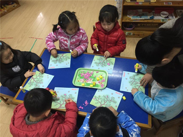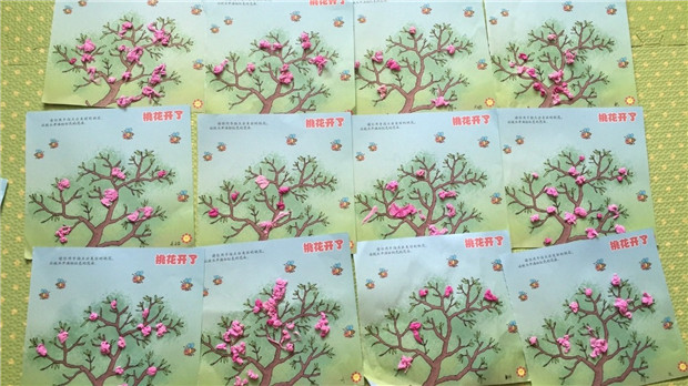 于是,便有了这场“自制桃花,花香满屋”的美术活动。老师和孩子们一起将粉色小纸条变成小纸片,再将小纸片搓成小纸团儿,然后用胶水贴在准备好的树杈上,就这样,一棵棵桃树开出来美丽的桃花,孩子们把这些桃花布置在教室的角角落落,让春天住进了我们教室里。