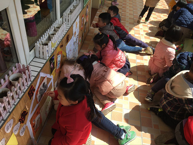 午饭后玩耍的时候,阳光正好,我们小朋友们结伴来看自己装饰出来的墙面,他们洋洋得意,告诉自己的小伙伴,那是他什么时候带来的和妈妈的照片,还有自己画的画是什么意思,他们聊得可开心了。