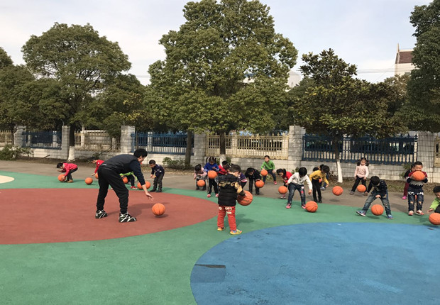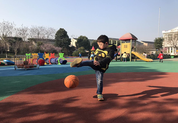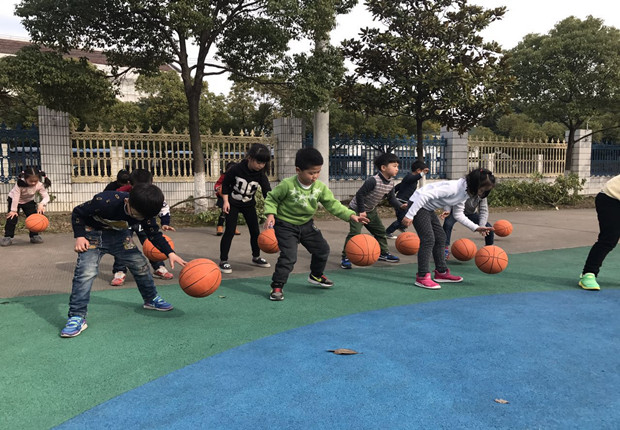 每天早上,大班喜欢篮球的孩子们都会自发出现在操场上,和着乐感极强的音乐,有节奏地拍打手中的篮球。在