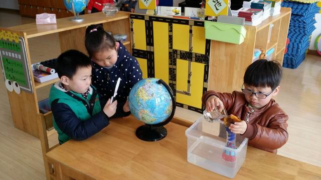 在新城逸境幼儿园的每个教室里,教师充分利用有限的空间,提供丰富的区域操作材料,因地制宜地创设了科探区、表演区、生活区、益智区、建构区等多个区域,开展丰富多彩的区域游戏。幼儿园每个班所创设的区域内容都各不相同,却又具有特色。