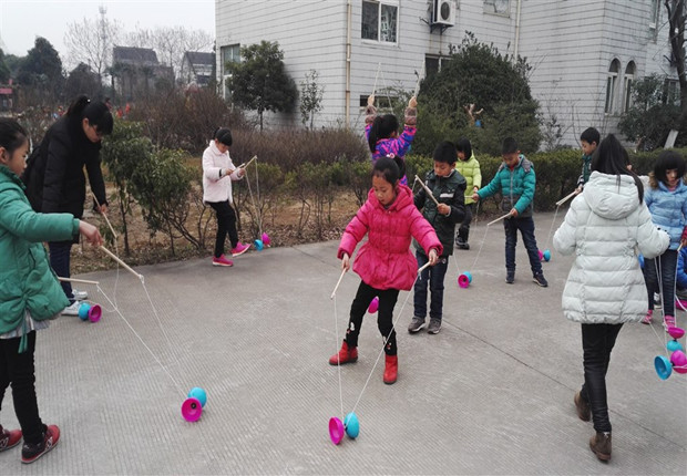 你看!操场上民间游戏花样多着呢!小班的孩子们有的玩丢手绢,有的跳方格,还有的玩老鹰捉小鸡,躲在老师身后的孩子们紧紧抓住老师的衣服,大家步伐一致地紧盯着前面的“老鹰”,生怕被捉住。中班的孩子们玩起了跳皮筋,她们的双脚一起一落,彩色的皮筋被震得上下晃动,孩子们一边跳,一边唱起了歌谣。大班的孩子们玩得更嗨了,他们抖空竹,滚铁环,这看似简单的滚铁环,实际操作起来却是很难的,需要一定的技巧和意志力,孩子们反复练习着,虽然也会有失败,但是在同伴、老师的鼓励声中大家的热情丝毫没有影响……整个校园都回荡在了老师和孩子们的笑声中。