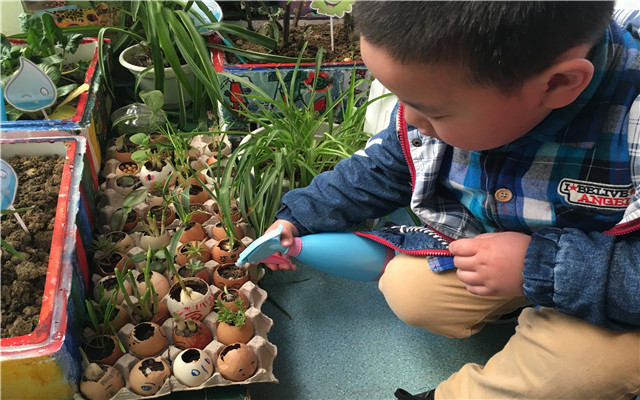 为了感受春天的气息,种植完成后还加入了体验活动,孩子们为蛋壳植物浇水、松土。活动中孩子们兴奋极了,在边劳动边交谈中,收获着种植的辛劳与快乐。