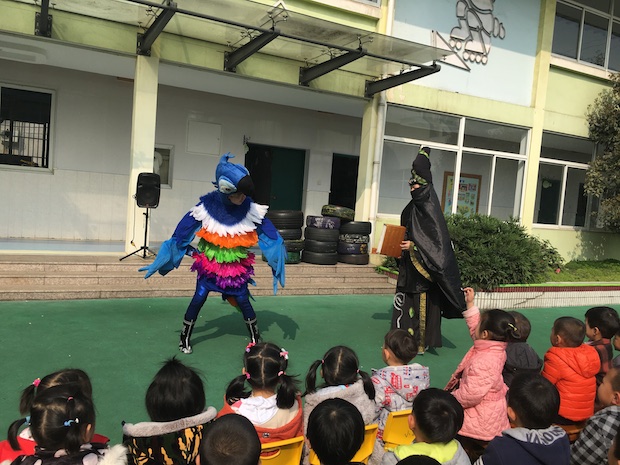 “童话剧”实质上是一种“表演游戏”,表演游戏就是幼儿根据文艺作品中的情节、内容和角色,通过语言、表情和动作进行表演的一种游戏,这与幼儿园以“游戏”为主的教育理念十分契合。本次演出的剧目是《阿拉丁神灯》,讲述了一个勇敢、智慧、诚实、坚强的小伙阿拉丁历经重重困难救出公主的故事,演员们身穿色彩鲜艳的演出服,头戴可爱的头饰,夸张的表情、富有表现力的动作、生动的语言,伴随着动听的音乐,把孩子们带入了童话的世界,深深地感染着每一位小观众,赢得了阵阵掌声。在故事表演的过程中,演员们还和孩子们进行互动,有奖问答,糖果奖励都将活动推向了高潮,在故事的结尾告诉孩子们:每个人,只要坚持信念,不怕困难,本着一颗善良的心,就能完成梦想。童年就是要充满梦想,童年就是要敢想敢做!