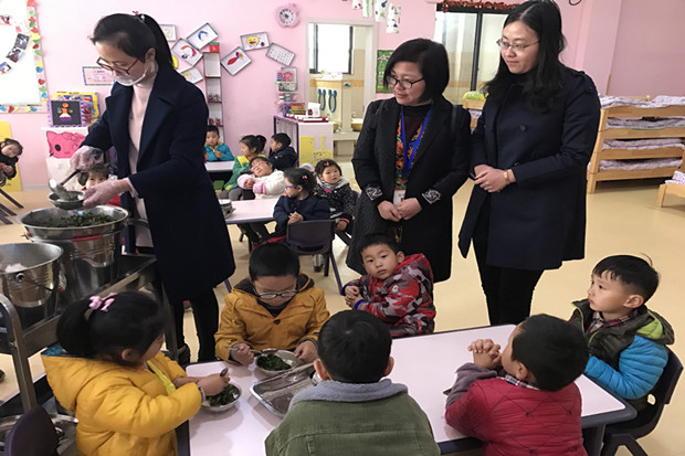 吴园长首先观摩了早操活动,天真可爱的孩子和青春活泼的教师在趣味游戏化的早操中相互配合,让操场上洋溢着活力和热情。接下来由朱老师带来的韵律活动《大家一起去旅行》,不仅课堂氛围活跃有感染力,孩子们结合经验对于舞蹈动作的创编也让吴园长大开眼界,运用自己的专业知识和眼光,吴园长向朱老师提出了上课的注意要素,为她进一步提高这节课的质量指明了方向。同时,吴园长还参观了我园食堂,排查了安全卫生隐患,在观察小班孩子进餐状况时,看到老师和保育员都能戴上口罩和手套分饭菜,孩子们都能安静有序地进餐,表示肯定和赞许。